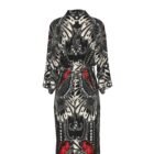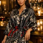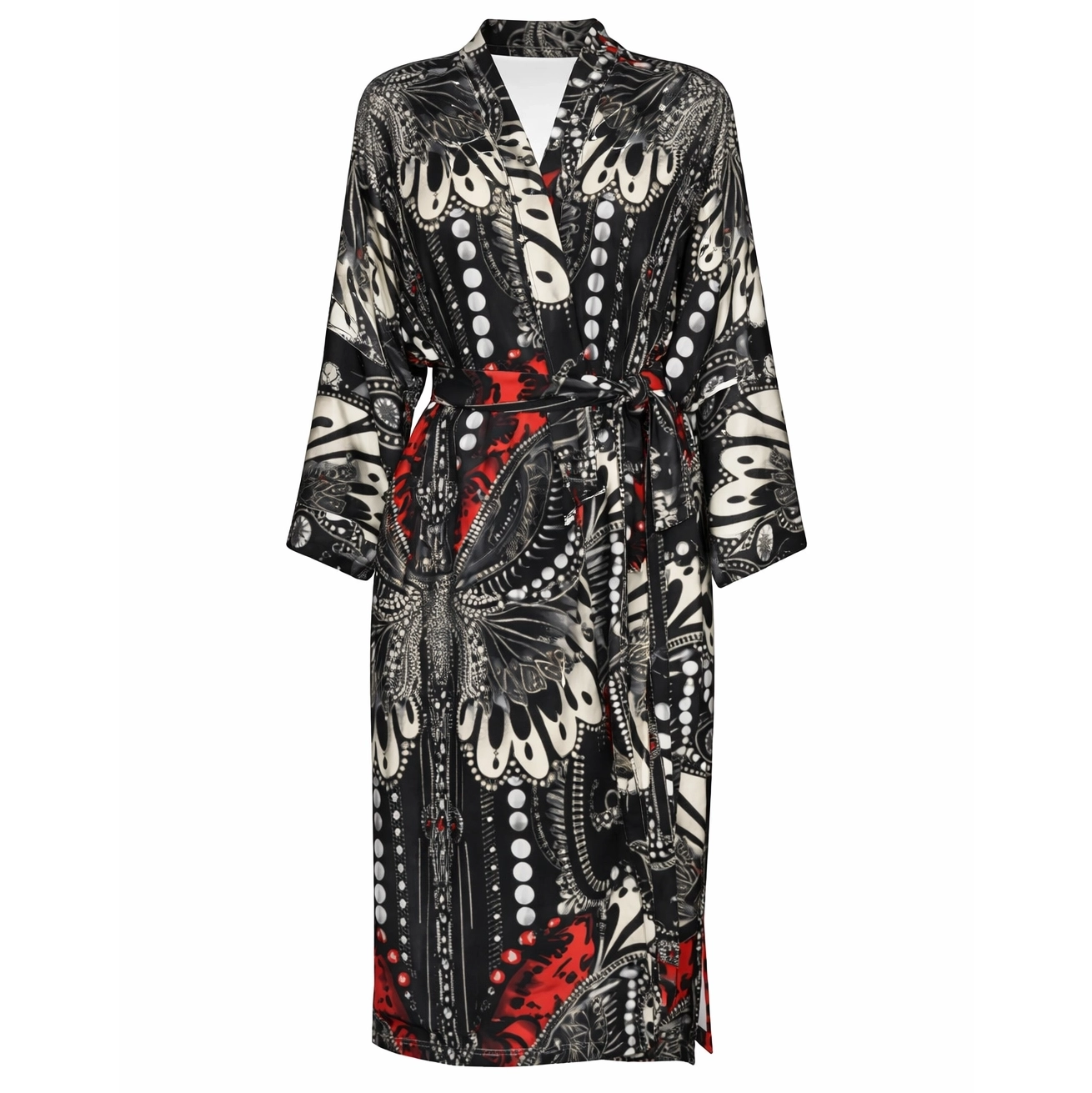 • Step into the kaleidoscopic wonders of Cinnabar, where abstract patterns inspired by African tribal butterfly motifs come to life. Introducing our exquisite satin kimono robe, a versatile addition to your wardrobe that seamlessly transitions from nightwear to a stylish throw-over for swimwear, or an elegant ensemble for evening affairs.Crafted with the utmost attention to detail, this satin kimono robe features mesmerizing abstract patterns reminiscent of African tribal art, adding a touch of cultural richness to your attire. Whether lounging at home, strolling along the beach, or attending a soirée, this robe promises both comfort and sophistication.