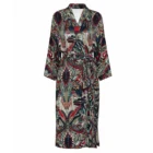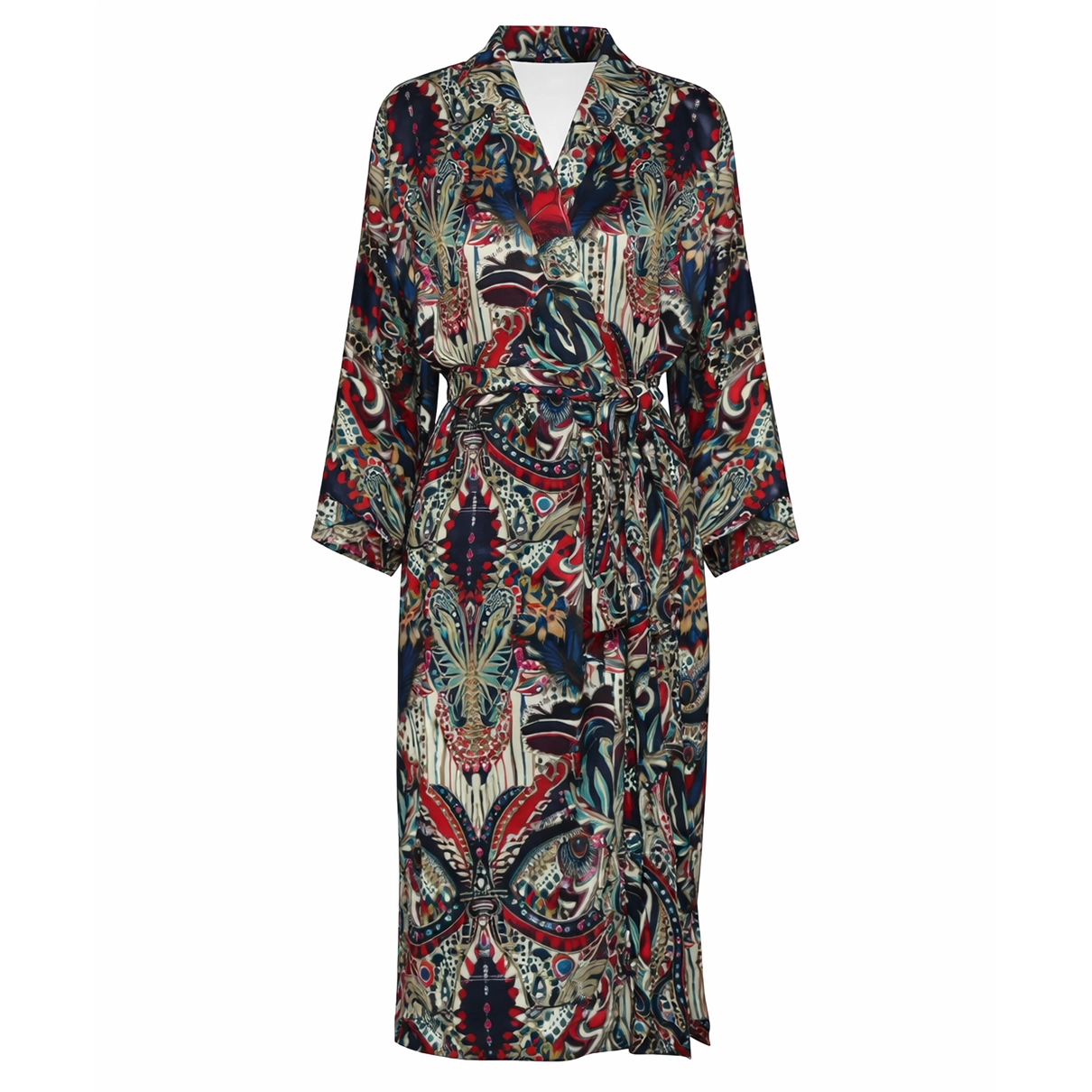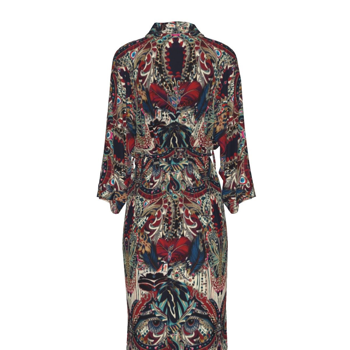 Enter the enchanting realm of Cirque, where the vibrant spirit of Cirque du Soleil masks and costumes intertwines with a tapestry of cultural influences. Lose yourself in the timeless elegance of our Cirque collection, where the exotic allure of African art melds seamlessly with the delicate grace of butterfly motifs and tribal inspirations. Introducing our stunning knee-length satin kimono robeāan exquisite addition to your wardrobe that effortlessly transitions from luxurious nightwear to a chic cover-up for swimwear or a sophisticated ensemble for evening engagements.