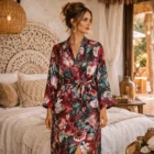 Step into the serene artistry of Enji, where the delicate beauty of Japanese ikebana flower arrangements is translated into flowing colour and form. This exquisite long satin kimono robe is a statement piece designed to move effortlessly between slow mornings, sun-soaked escapes, and elegant evenings.