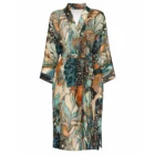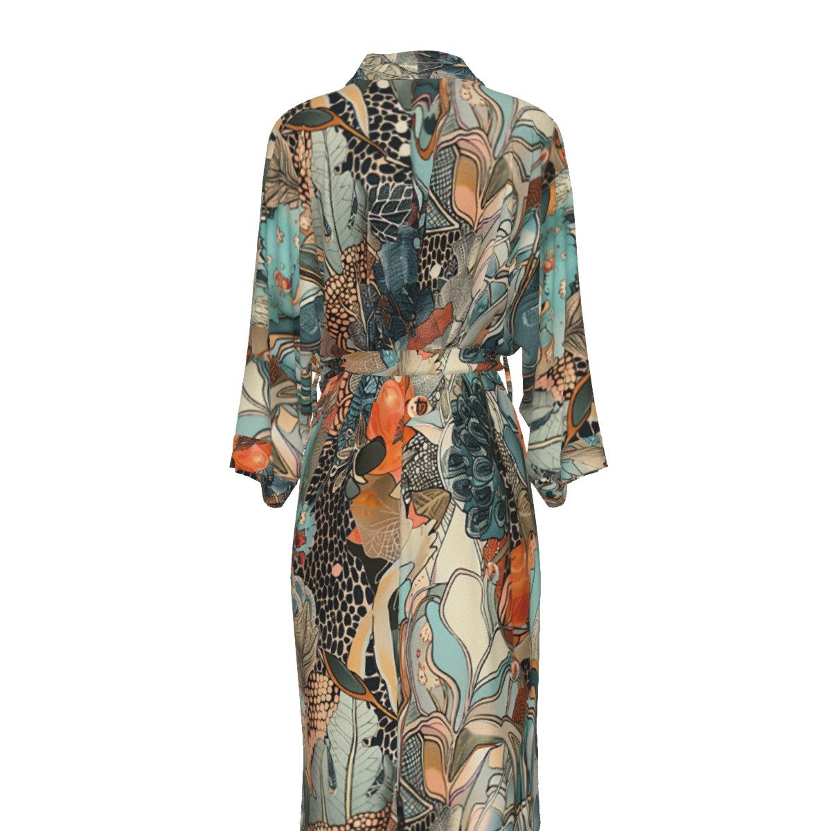 Enter the enchanting realm of Ikebana, where abstract patterns inspired by the art of Japanese flower arranging blossom into vivid life. Introducing our stunning knee-length satin kimono robeāan exquisite addition to your wardrobe that effortlessly transitions from luxurious nightwear to a chic cover-up for swimwear or a sophisticated ensemble for evening engagements.