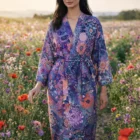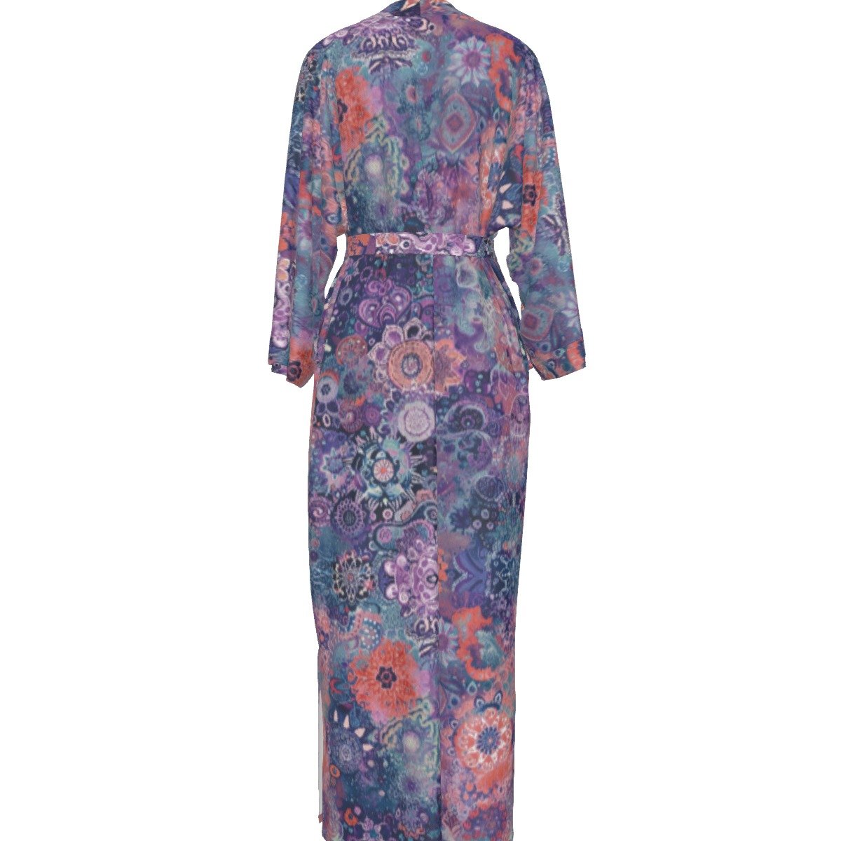 Enter the dynamic realm of Mandala, where intricate illustrations inspired by mandala and paisley patterns come to life in bold shades of lavender, coral, and teal, evoking the mesmerizing spirit of mandala art. Our satin kimono, carefully crafted from lightweight fabric, ensures a comfortable experience tailored for individuals with a free spirit.