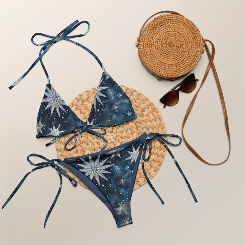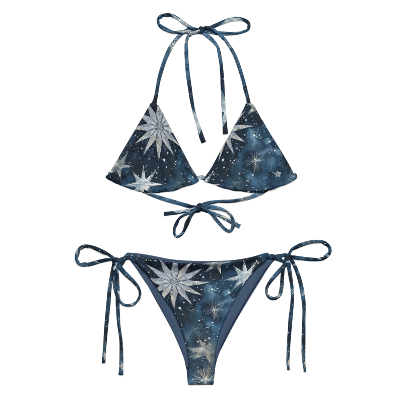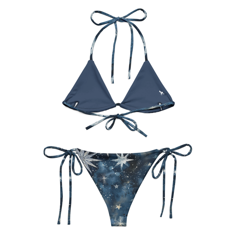 Elevate your beach style with our Nebula String Bikini top designed for both comfort and fashion. Crafted from soft recycled polyester with double-layering and UPF 50+ protection, this bikini ensures a memorable swim. Customize the straps to your liking and enjoy the unique, art-inspired fabric that makes each piece a one-of-a-kind creation. 🏄♀️👙🌞 #SwimInStyle #EcoChic #CustomSwimwear