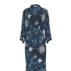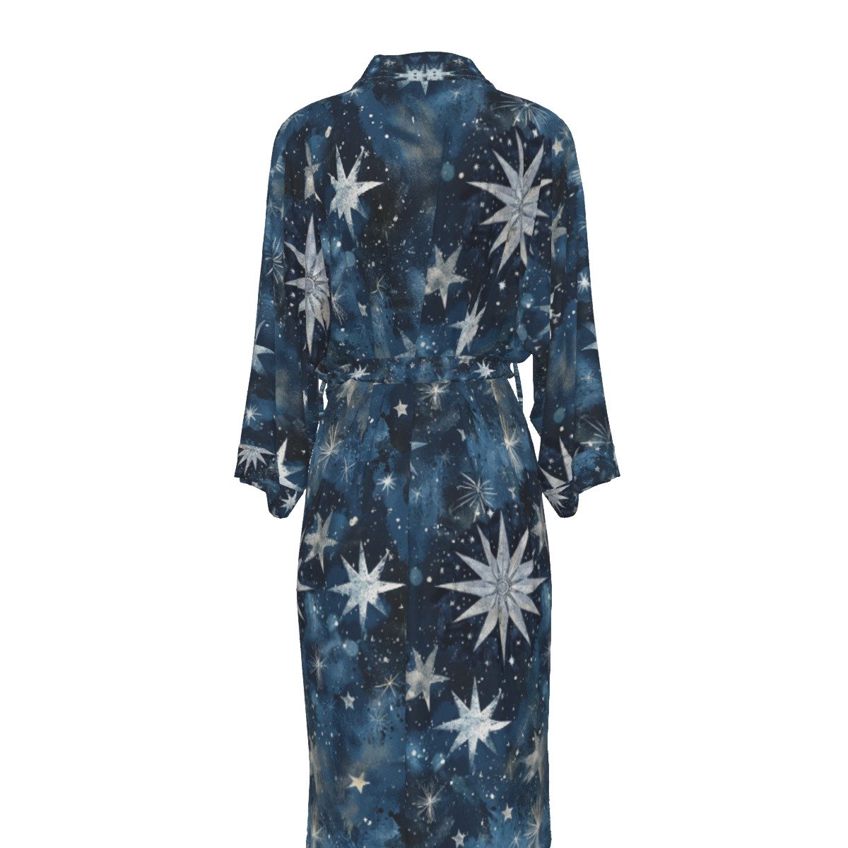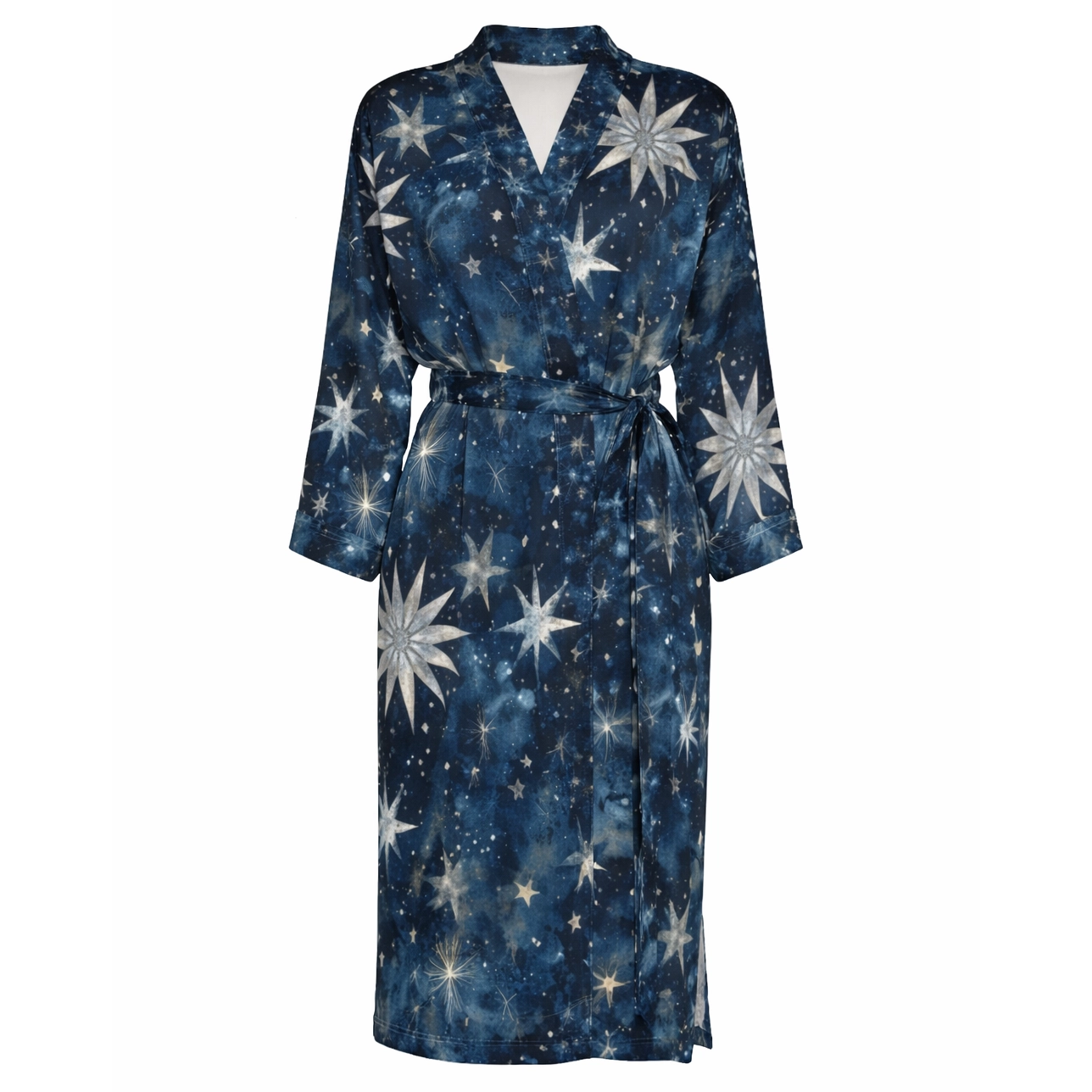 Crafted with the utmost attention to detail, this satin kimono robe features mesmerizing abstract patterns of jewelled stars , adding a touch of cultural richness to your attire. Whether lounging at home, strolling along the beach, or attending a soirée, this robe promises both comfort and sophistication.