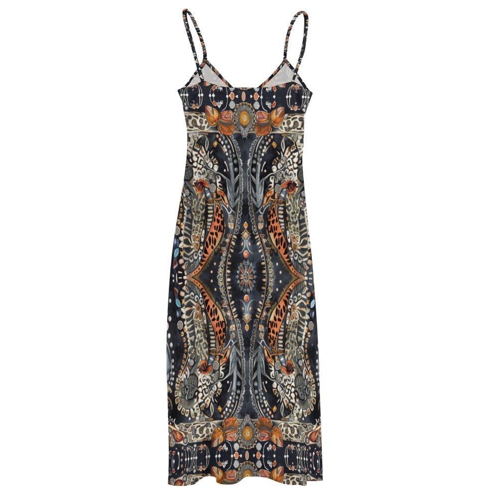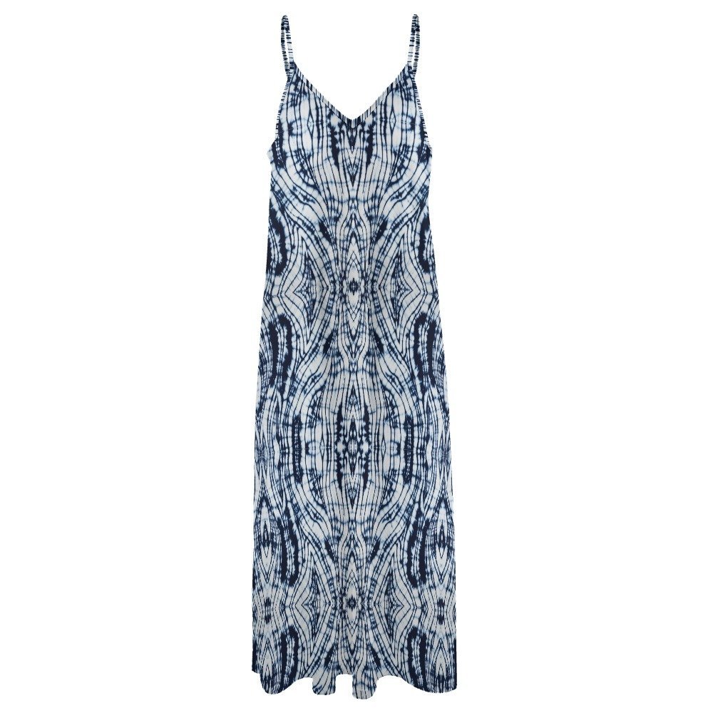 Step into the serene ambiance of Kaze, where delicate white and wavy lines artfully mimic Shibori tie-dye inspired designs, complemented by watercolor paint brush strokes in shades of navy and white, reminiscent of Japanese art. Immerse yourself in the timeless elegance of our spaghetti strap beach dress, tailored from jersey fabric for a luxurious and comfortable experience.