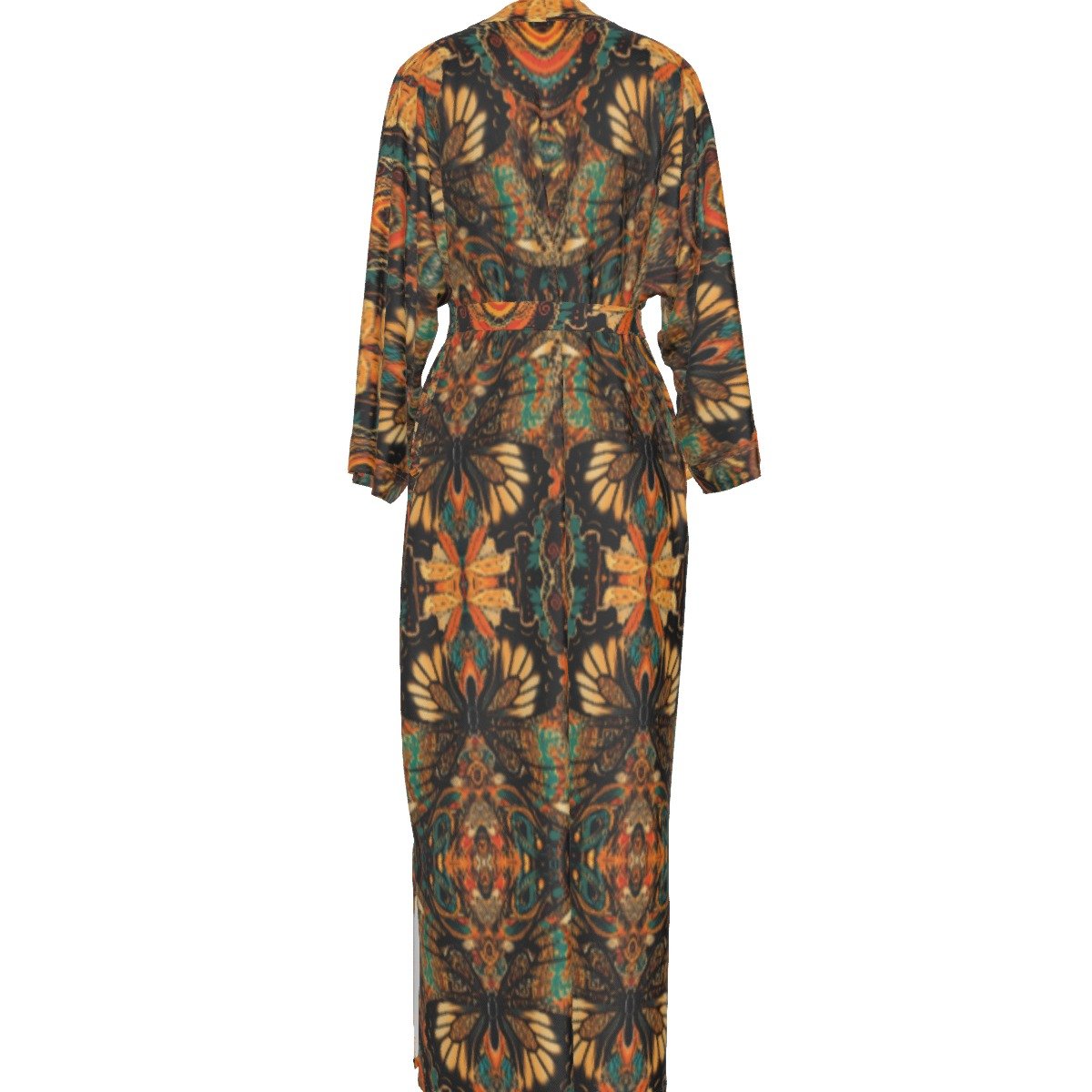 The Spirit Kimono is inspired by transformation, freedom and the symbolic language of shamanic patterning. Butterflies – long associated with renewal and metamorphosis – are woven into bold, tribal-inspired prints, creating a piece that feels both ancient in its symbolism and contemporary in its expression.
