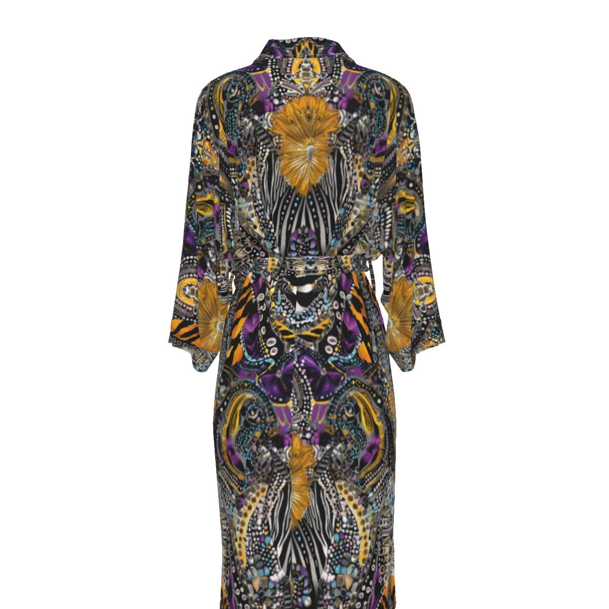 Step into the kaleidoscopic wonders of Zuri, where abstract patterns inspired by African tribal motifs come to life. Introducing our exquisite knee length, satin kimono robe, a versatile addition to your wardrobe that seamlessly transitions from nightwear to a stylish throw-over for swimwear, or an elegant ensemble for evening affairs.
