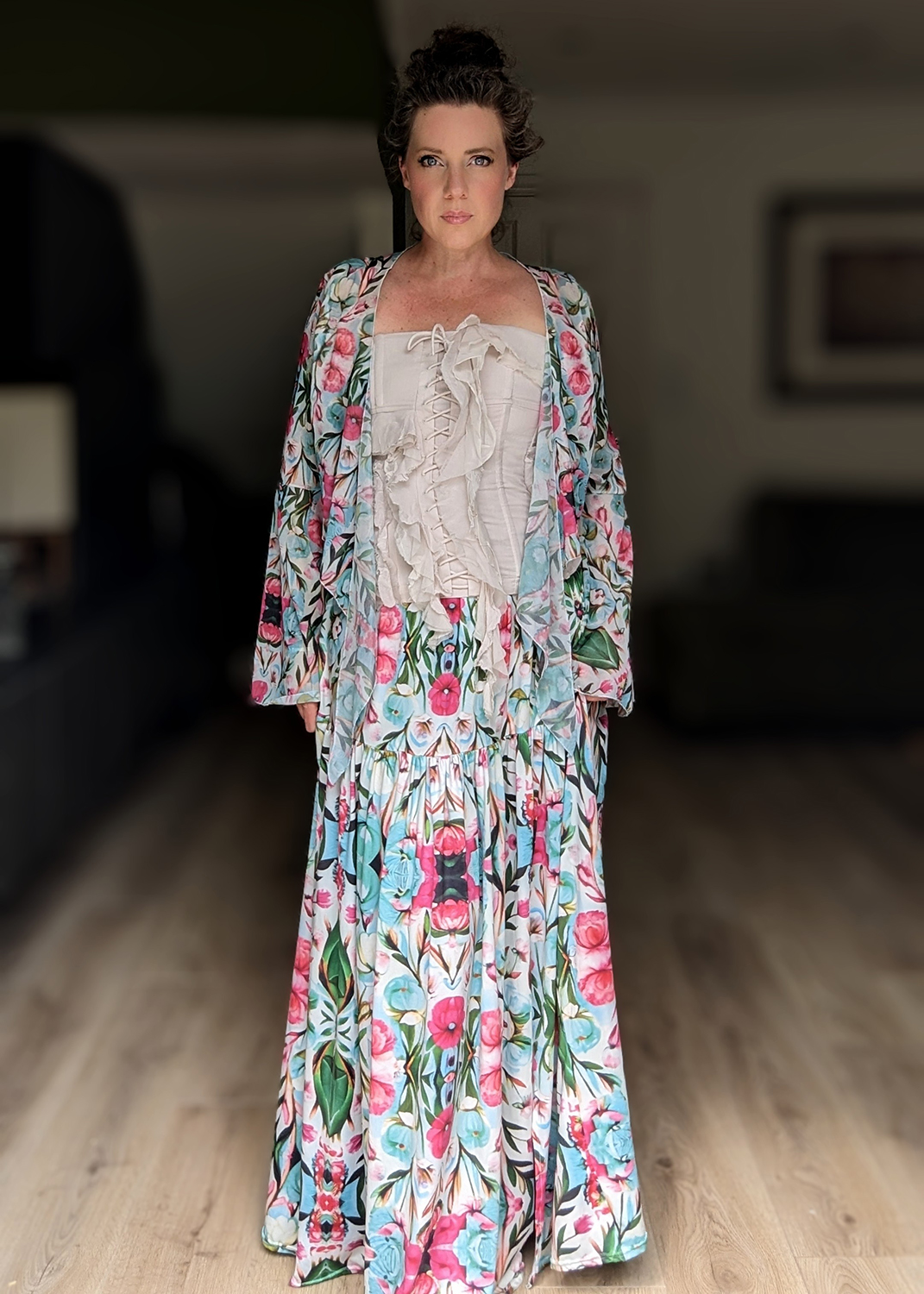 To create a visually appealing outfit, balance the busy patterns of the Katsura clothing with solid-colored tops or skirts. For example, if you have a vibrant patterned skirt, pair it with a plain top in a coordinating colour. Alternatively, if you’re wearing a patterned top, opt for a solid-coloured skirt in a complementary shade.